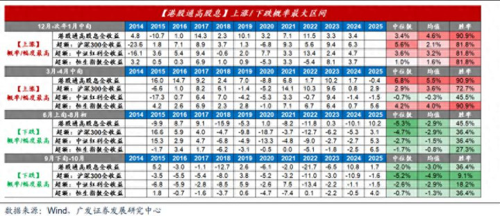 以跟踪广泛、历史较长的港股通高股息全收益指数为参考,自2014年至今的统计显示:在此期间(12月-次年1月中旬),绝对收益亮眼——上涨概率高达 90.9%,期间涨幅中位数达 3.4%,平均涨幅 4.6%。意味着几乎年年上涨,且平均收益可观。